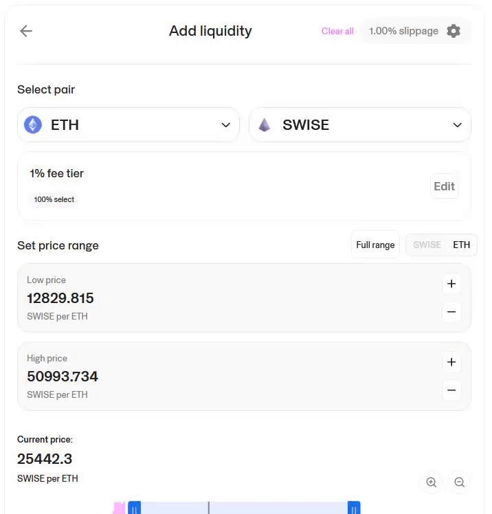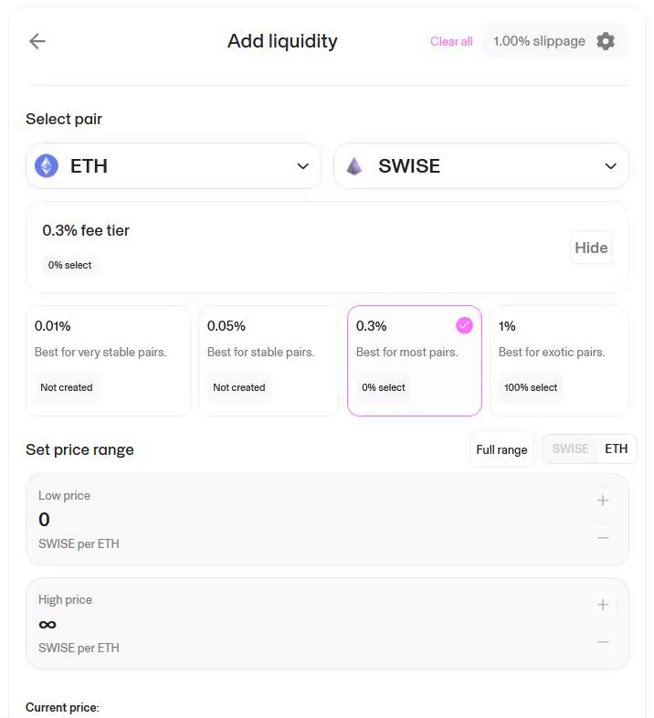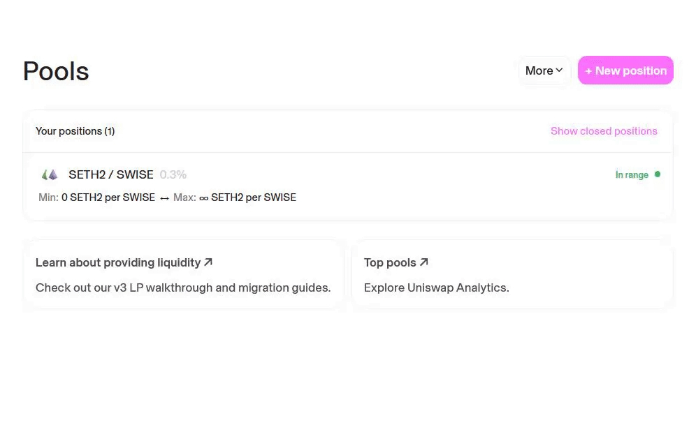 This guide will walk you through the process of adding liquidity to the SWISE-ETH pool on Uniswap V3. Follow the simple steps below to proceed.